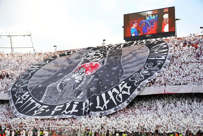 而在塞维利亚举办的决赛,远征的规模达到了令人瞠目的顶点:约12万球迷涌入城市,将决赛地变为法兰克福的第二主场,俱乐部主席彼得-费舍尔那句“我们有19万远征球迷都没办法挤进这个米奇妙妙屋球场”的调侃,道出了这种忠诚的甜蜜负担。法兰克福死忠球迷花费5万欧元制作了巨型Tifo,全部设备和工具甚至用了7辆卡车才从波兰被运往塞维利亚,不计成本地为球队制造了十足的压迫感。球队也没有辜负球迷们的热切期待,点球击败格拉斯哥流浪者,时隔42年再度欧战称王。
